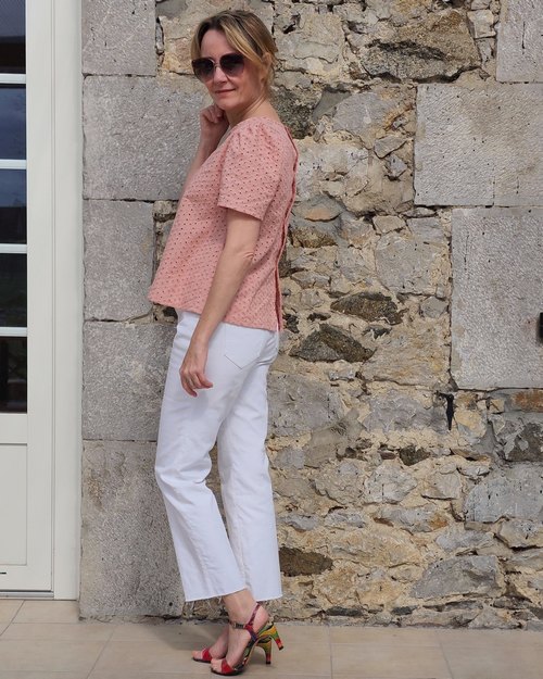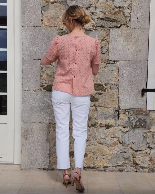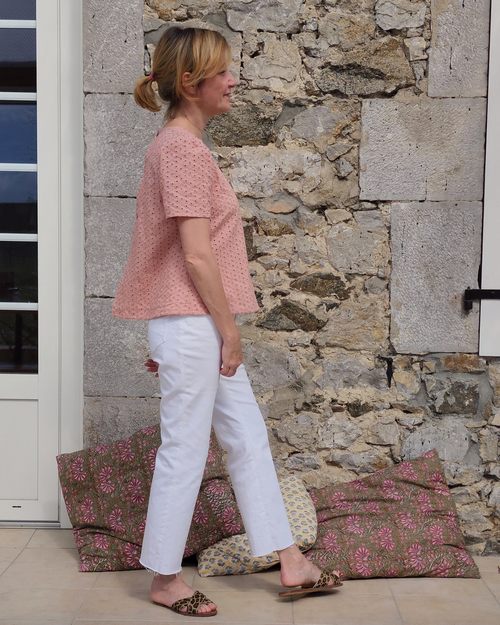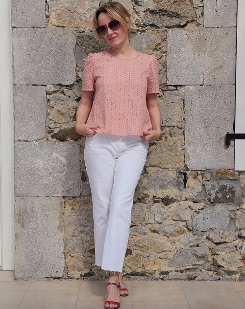 TISSU : La blouse Patti est une blouse trapèze, donc évasée sur le bas. Des tissus fluides donneront à la blouse un tombé souple. Des tissus plus raides comme la broderie anglaise, du plumetis coton, mettront plus en avant le côté trapèze de la blouse. Beaucoup de tissus sont donc adaptés à la réalisation de la blouse Patti et vous pouvez prendre de la viscose, du tencel, de la soie, du coton, de la broderie anglaise …