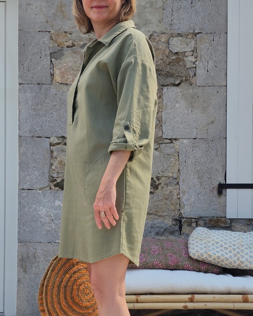 Ses manches 3/4 avec finies par un biais et une petite patte de boutonnage pour les remonter sont parfaites pour l’été, à porter en ville ou même en sur-maillot pour la plage, vous allez l’adorer.