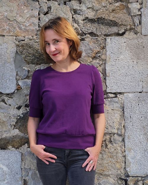 - en tissu jersey coton bio noir et violet de chez Torretto tessuti (15 coloris disponibles!) (205 gr / m2) taux d’élasticité 30%
